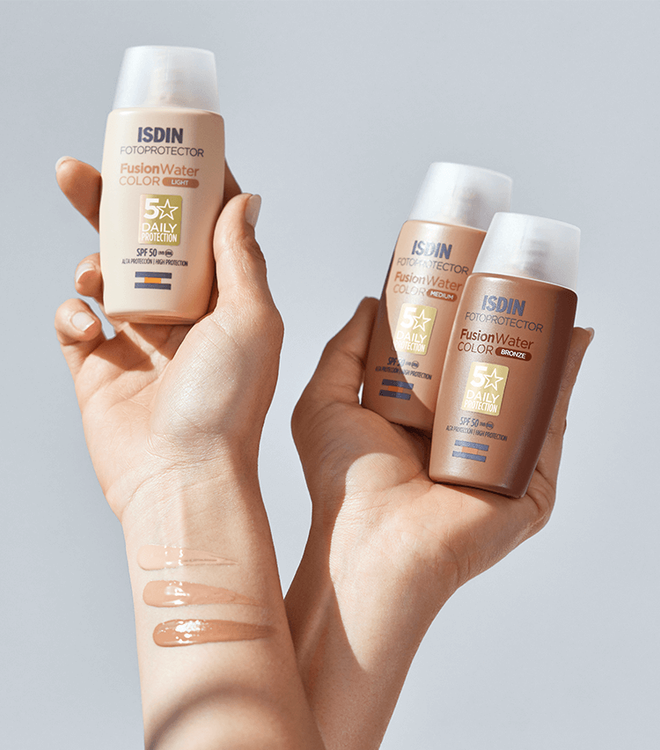 ضد آفتاب رنگی فیوژن واتر ایزدین SPF50 بر پایه آب است و به سرعت جذب می شود. این ضد آفتاب بافت سبک و رنگی دارد که قادر است نقص های پوست را بپوشاند و ناهماهنگی های تناژ پوست را تا حدودی اصلاح کند. جلوه این ضد آفتاب پس از استفاده مات است و قادر است ظاهری یکدست و ابریشمی به پوست شما ببخشد. کرم ضدآفتاب فیوژن واتر باعث تحریک و سوزش چشم ها نشده و می توان آن را در ناحیه ی اطراف چشم نیز استفاده کرد.