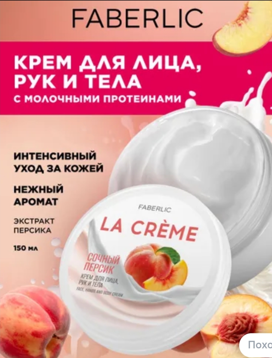 • کرم صورت، دست و بدن Faberlic La Creme Juicy Peach به شدت از پوست شما مراقبت میکند و شما را در رایحهای دلپذیر غرق میکند.