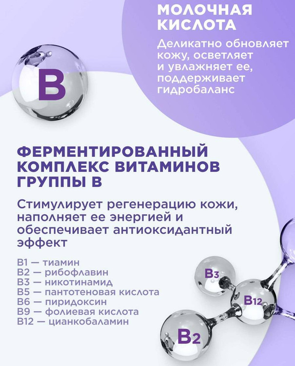 • کمپلکس ویتامین B تخمیر شده* بازسازی پوست را تحریک، انرژی میدهد و اثر آنتیاکسیدانی دارد.